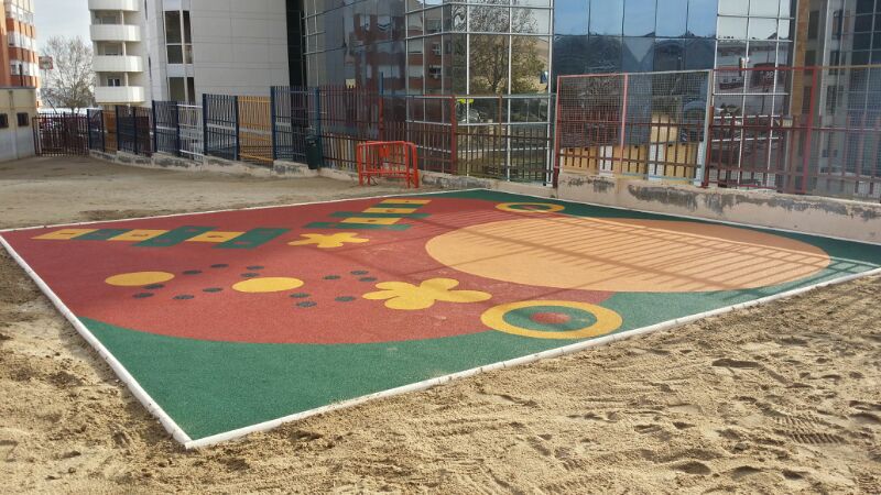 A mix of both sand and wetpour surfacing in a playground area in Madrid