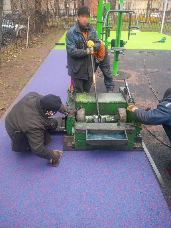 If we combine the small dimensions with the presence of poles of play or fitness structures, springs or ropes of play equipment, feet of street furniture and complex designs using many colours and graphics, all this makes the efficient use of paving machines a bit difficult, so hand made is a must or as indicated in a previous blog a heated roller may be helpful.
