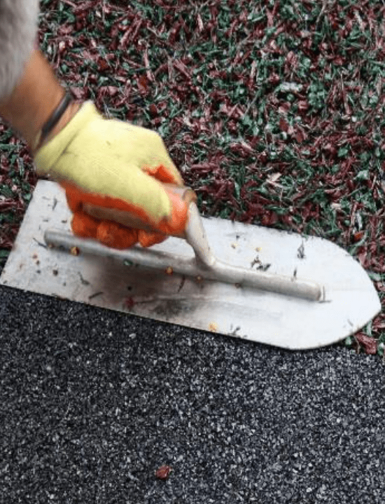 Due to the lower density of rubber mulch, its usual presentation is in 10 kg bags and the most common binder percentages are 18-22%. The material can be applied with traditional tools and common smoothing agents. It can be levelled to the required thickness by rake, screeds or trowel and then smoothed and lightly compacted with a roller or trowel.