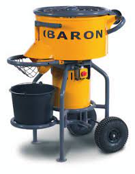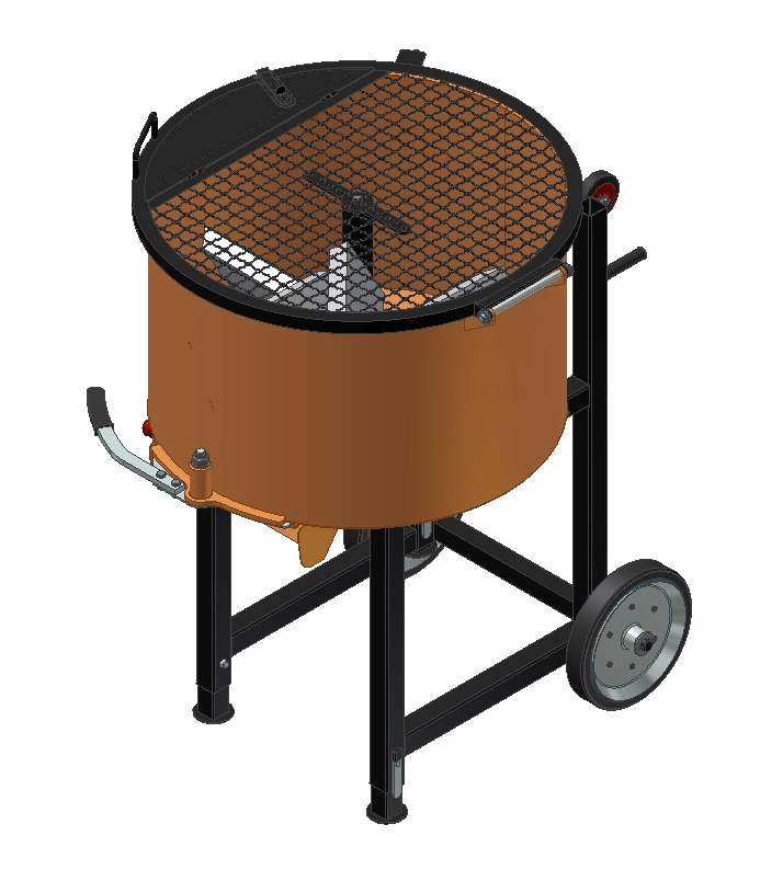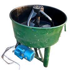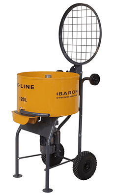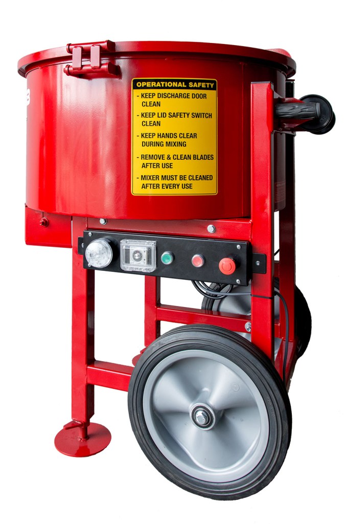 - A pan type with electrical motor, top opening and bottom outlet door handle to deliver the mix easily to your wheelbarrow