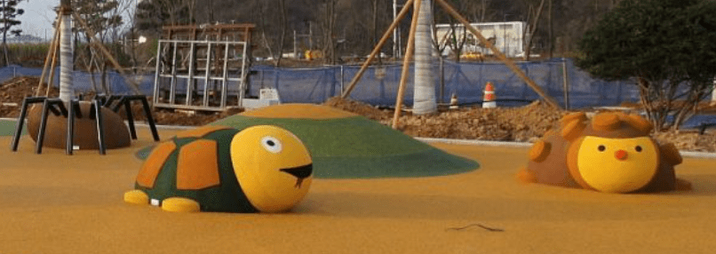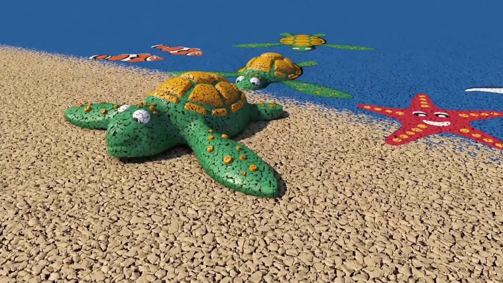 Later on, 3D shape solutions appeared such as the wide range of Playtop® animals of around 1 m in height or the smaller 3D prefabricated pieces and heights of up to 600 mm from companies such as 4Soft, that allow the flooring to become a additional element to play or integrate into a themed environment with the rest of the playground equipment.