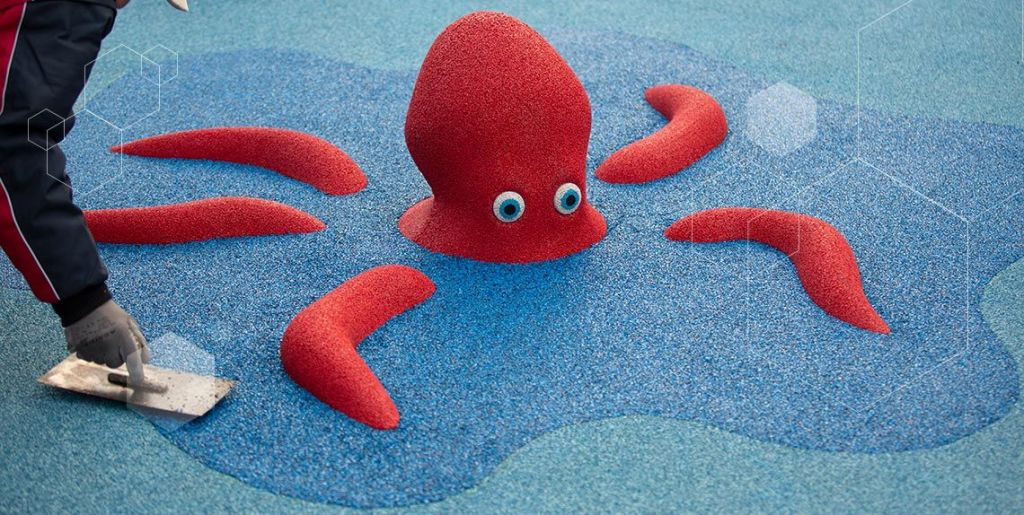 One of the great advantages of wetpour rubber flooring is the possibility of making very creative designs with basic colours, blends of different colours, graphics or logos and 3D shapes that serve as play elements, thereby increasing the playful value of the safety flooring.