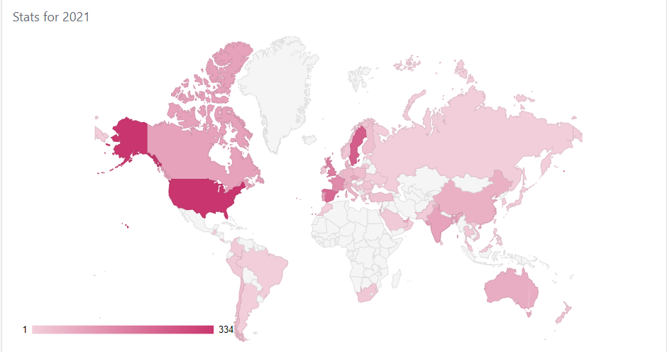 These is the Worldwide heat map by number of views of the blog 2021 year to date.