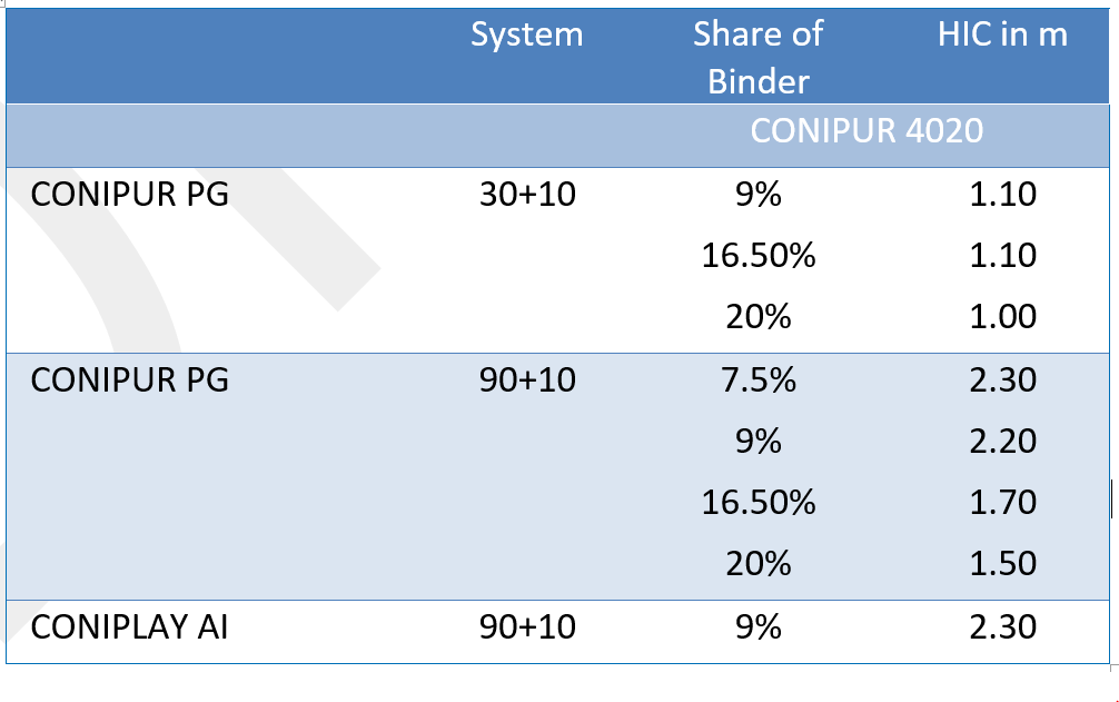 In the top wearing layer there is no significant influence on the impact absorption capacity, so reducing the percentage of binder has no positive influence on it and instead puts the durability of this wear layer at a serious risk.