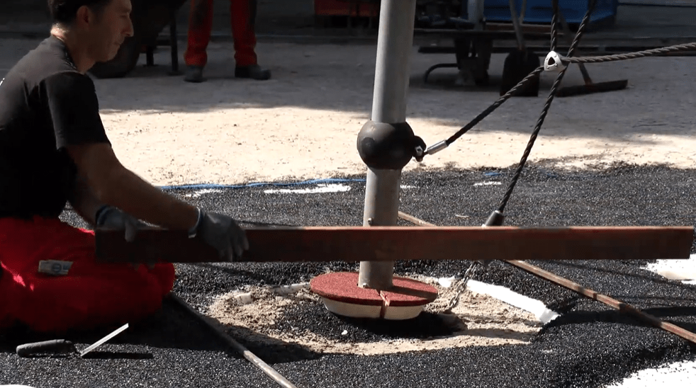 This creates a challenge when using continuous flooring as the rubber wetpour. In this case to do the foundations inspection the wetpour must be cut, removed and when inspection has finished area has to be cleaned, new rubber material mixed, primed and re-installed to get the surfacing at the appropriate thickness. Probably a different colour will have to be used what in some way will modify the original design.