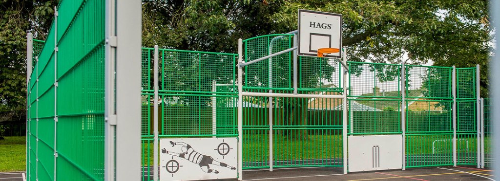 In the vicinity of many outdoor playgrounds and at several schools there is usually a ball game area, protected by closed anti-vandal fences of wood or steel that include goal posts and baskets for various sports, in which children can practice multiple games with balls, with the advantage of fences keeping the ball in play and avoiding the risks of hitting and damaging other children.