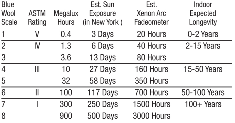 This Blue Wool scale is used also by manufacturers of paints for artists in the ASTM D5067 Standard, you can see the equivalent estimated Sun exposure and Indoor expected longevity for a class number in the scale.